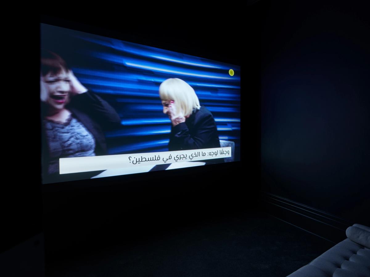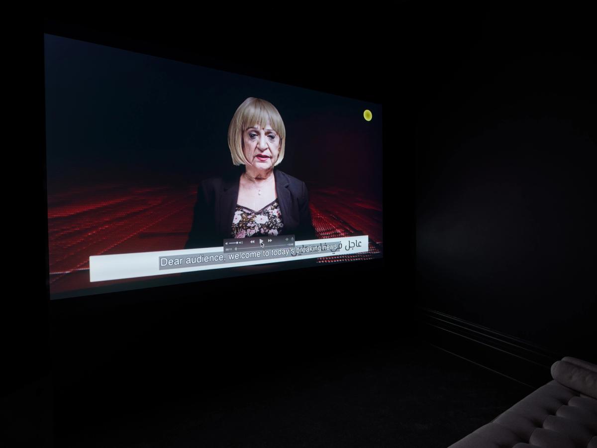 Tomorrow, Again, by Mona Benyamin stages a dysfunctional news broadcast that consists of different segments which recreate and react to various prominent daily catastrophes from Palestine. Instead of a spoken narrative, the film resorts to exaggerated emotional and physical displays. It utilises fragmented and often conflicting testimonies, doppelgängers, and a surrealist visual language to draw on notions of truth and fiction, and differing temporalities. The cast of the film sees two protagonists, the artist’s parents, assume multiple identities as they narrate and consume their own stories in an endless cycle.