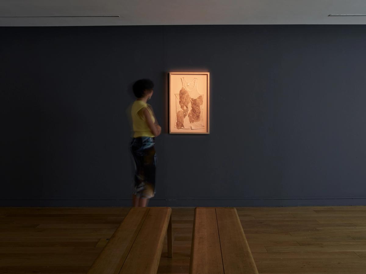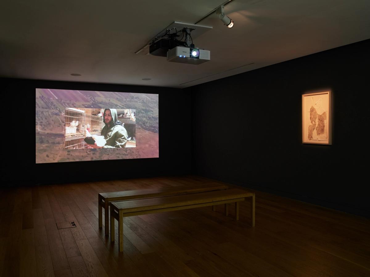 Dina Mimi’s project The melancholy of this useless afternoon unfolds through two chapters reflecting on the role of the fugitive and the smuggler. Chapter I layers images of birdsong competitions, revolutionary songs from Oman, Yemen and Palestine with a narrative contemplating movement, loss, separation, and revolutionary practice. Chapter II employs a clandestine style to document the practice of bird smuggling and the part the human body plays in this act. These are accompanied by a framed vest with an organic material resembling what the birds are traditionally hidden within.