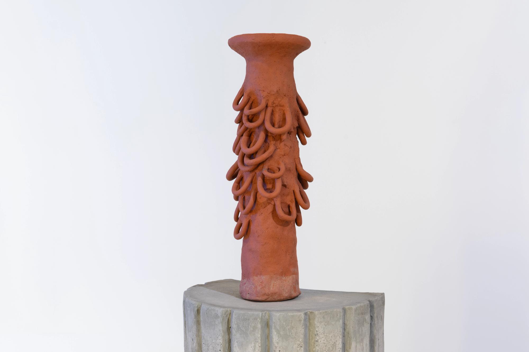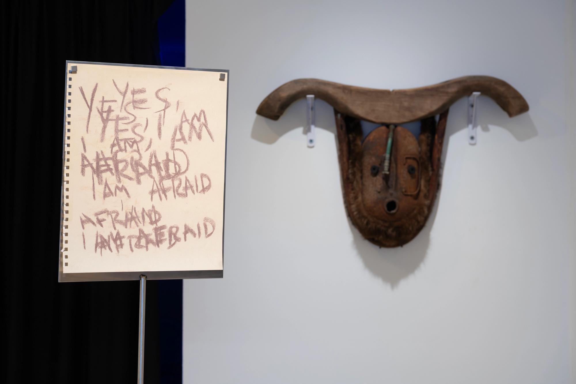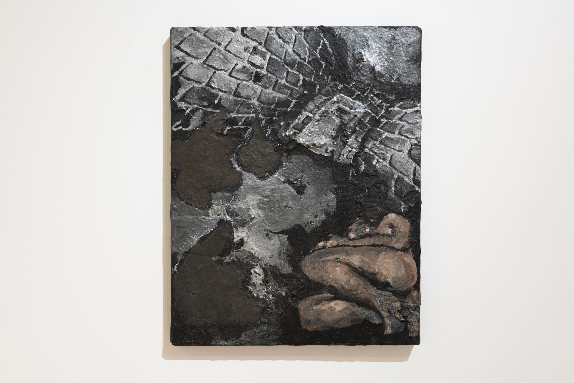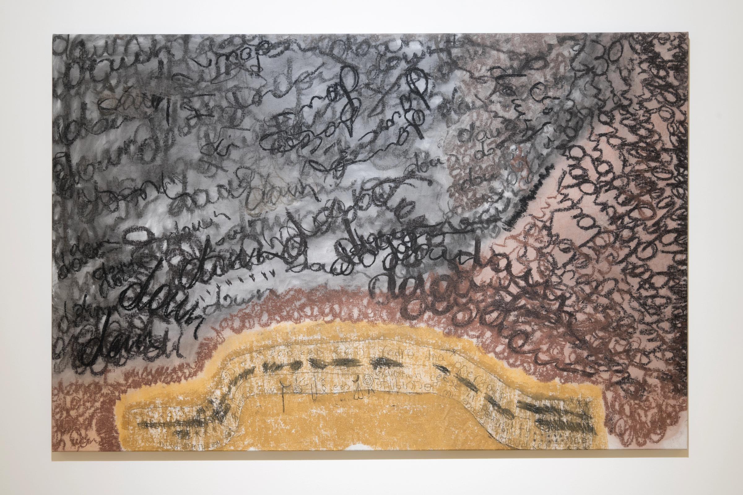 Working with text as both episteme and materiality, Jota Mombaça’s anticipation (at dawn) grapples with the notional limit of language as a horizon of potentiality. This work, through abstraction and literality, is a text written and rewritten with charcoal and paint on a canvas, forming a scenery at the edge of legibility. The written matter, unintelligible as a sign, yet legible as text, testifies to a shift in the artist’s practice that initially centered ritual and performance, which becomes illegible upon moving from the South American continent into Europe. Abstraction and linguistic opacity in this instance become processes borne of the need to find new aesthetic languages that escape neoliberal cooptation and colonial signification. When Mombaça was in Brazil, her practice centered on performative practices that were aesthetically and conceptually unforeign for the cultural-social environment. Yet with the move to live and labor within the European continent, she realized that parts of her performative and ritualistic aesthetics, which are all culturally nuanced in Latin America, can easily be subsumed into colonial-capitalist modes of reproduction and exoticization that will only be legible through culturalized voyeuristic registers. Removing her queered and racialized body from the scene rendered spectacle, and centering painting and sculpture in its stead, anticipation (at dawn) emerges as a material response to institutional representational demands, unable to shake off the grips of the market’s object-commodity fetish. — Adam HajYahia