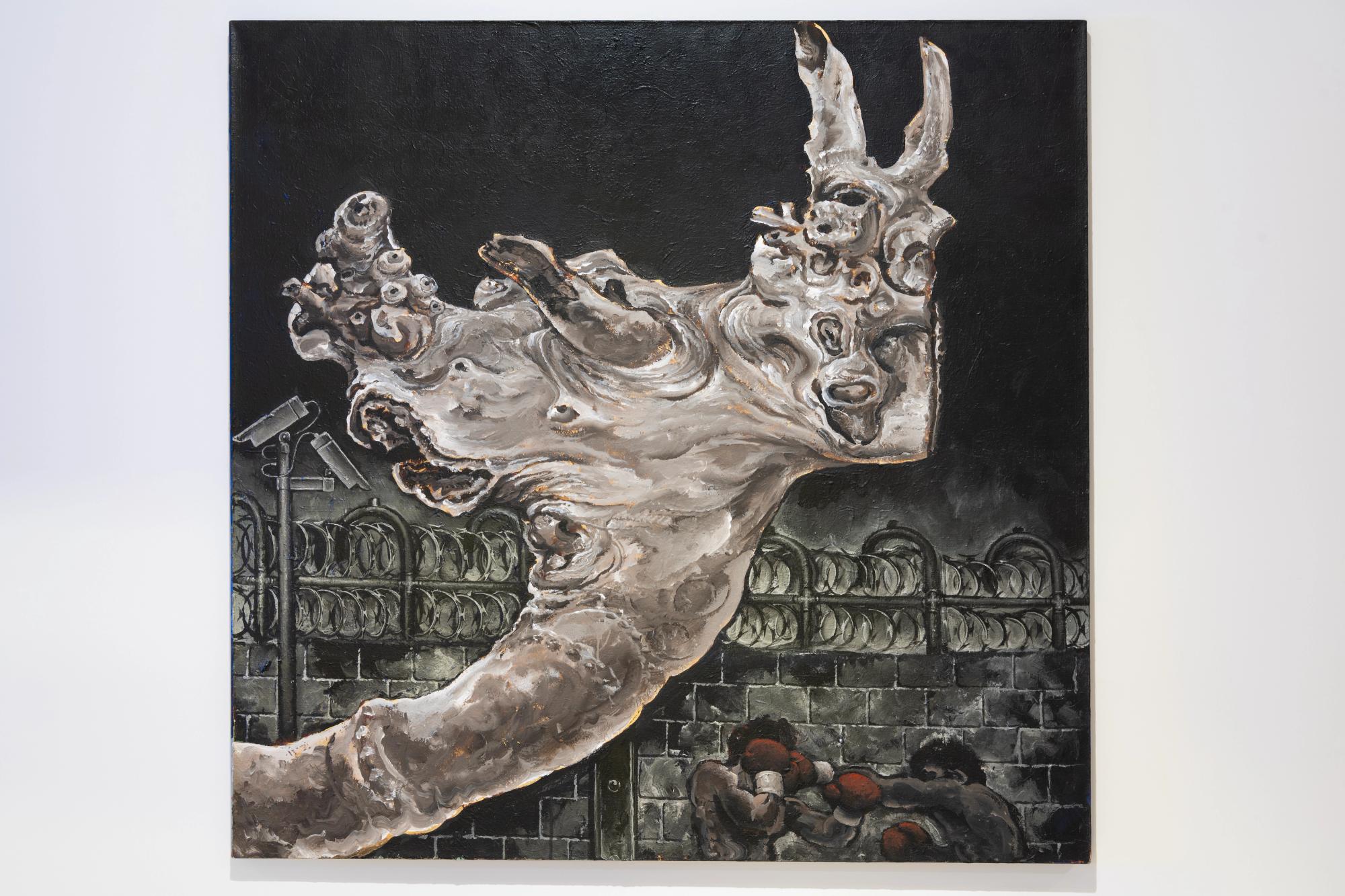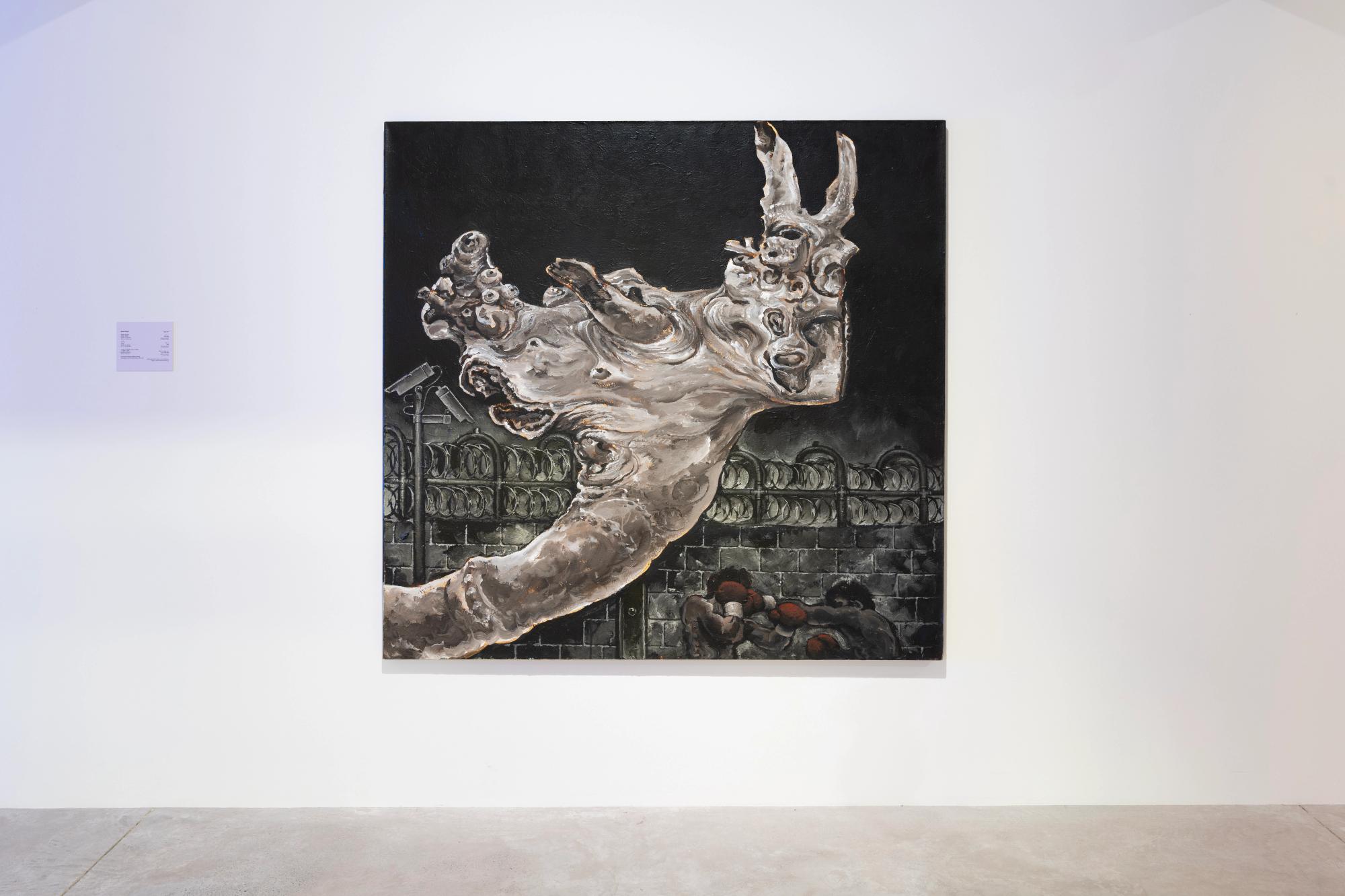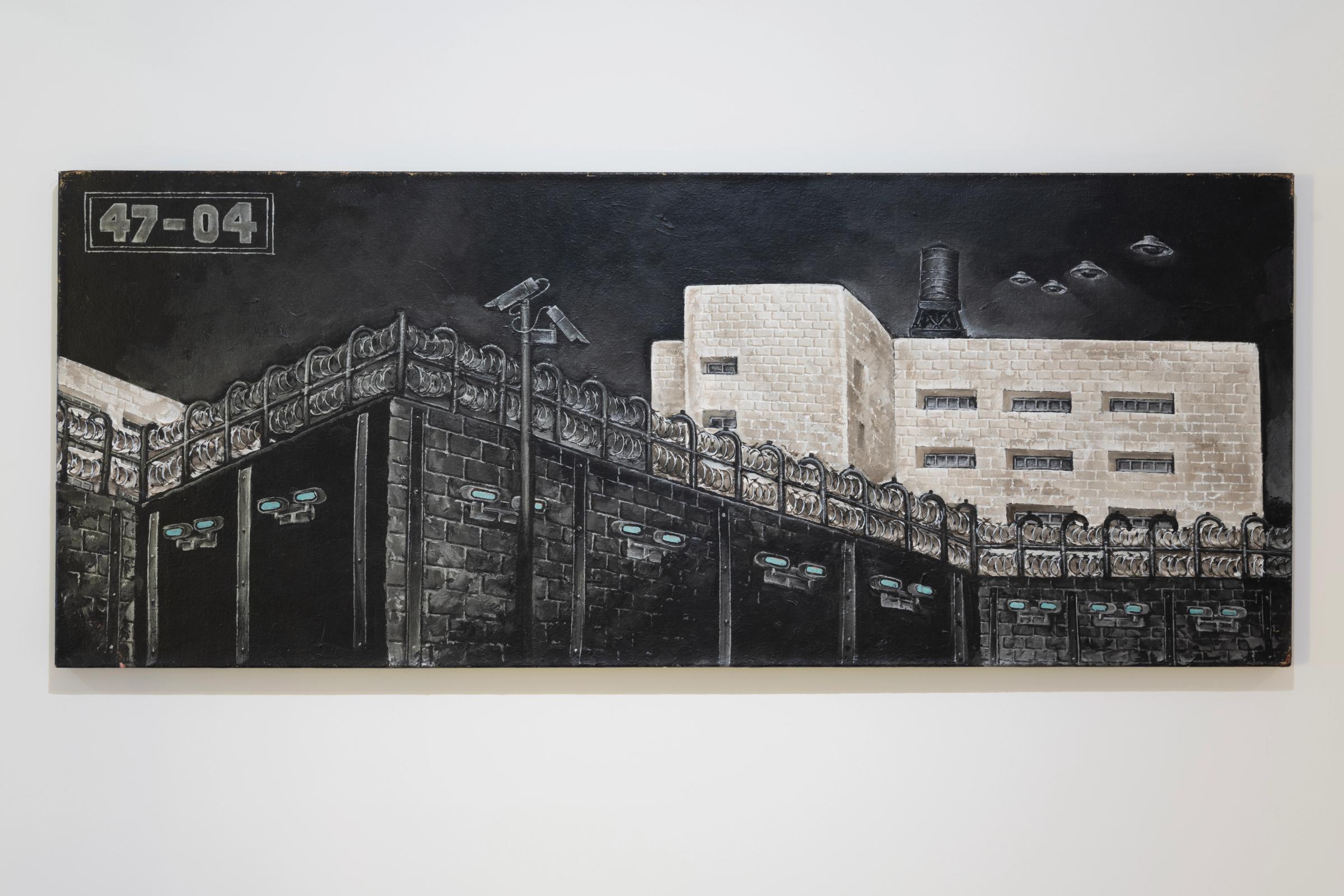Unlike the majority of his painting repertoire, which is defined by realist colorful scenes and luscious reds and browns, the three paintings in the exhibition stand out in their strict blacks, whites, and greys. All three paintings deal with prisons and their infrastructures of surveillance and dehumanization, but also eerily gesture towards a more surrealist departure in his language that lingers in the small moments prisoners cling to, persisting on life. — Adam HajYahia