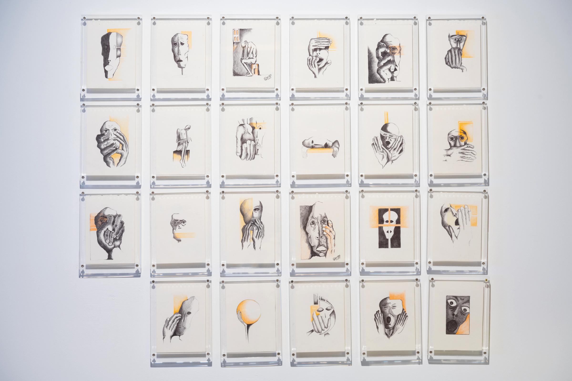This series of sketches is not merely ink on paper, but an attempt to materialize the hardships Palestinian prisoners face in Israeli prisons. The moment of detainment might seem like a technical time of quantifiable units. Still, for the Palestinian prisoner, it is a moment of radical transformation, a transition from one time to another, a “passage.” Minutes become endless years that persist even after the instance when the state of captivity is broken. The moment of detainment is not merely the initiation of the struggle between the body and what holds it captive, but a struggle between the body and the soul, as the prisoner fights against what tries to break him/her from within to maintain a transcendence from the material conditions of incarceration. The series reflects the personal experience of the artist, as he was held captive in Israeli prisons twice in his life, spending time “inside” for four and a half years, moving between prisons, from cell to another, measured not by time units but transitions across degrees of light and darkness. The initial versions of these sketches were made in prison and were shortly after discarded, as their making was prohibited by the Zionist carceral system. This current presented version is a resurfacing of the previously discarded, a material representation of a ghostly aesthetic form after the artist was set free. The sketches illustrate the first moments of capture and heavy days of interrogation, where the prisoner experiences the most inhumane of conditions. The scenes depict the points of tension and torture, faces turned into stone and wood, the points through which the struggle unfolds between resilience and disappearance, hope and despair, a wounded body, and a soul that insists on collective preservation despite sanctioned isolation and solitude. A social debt accumulated from the bodies of prisoners. A temporal debt of time extracted by the contemporary colony. — Adam HajYahia