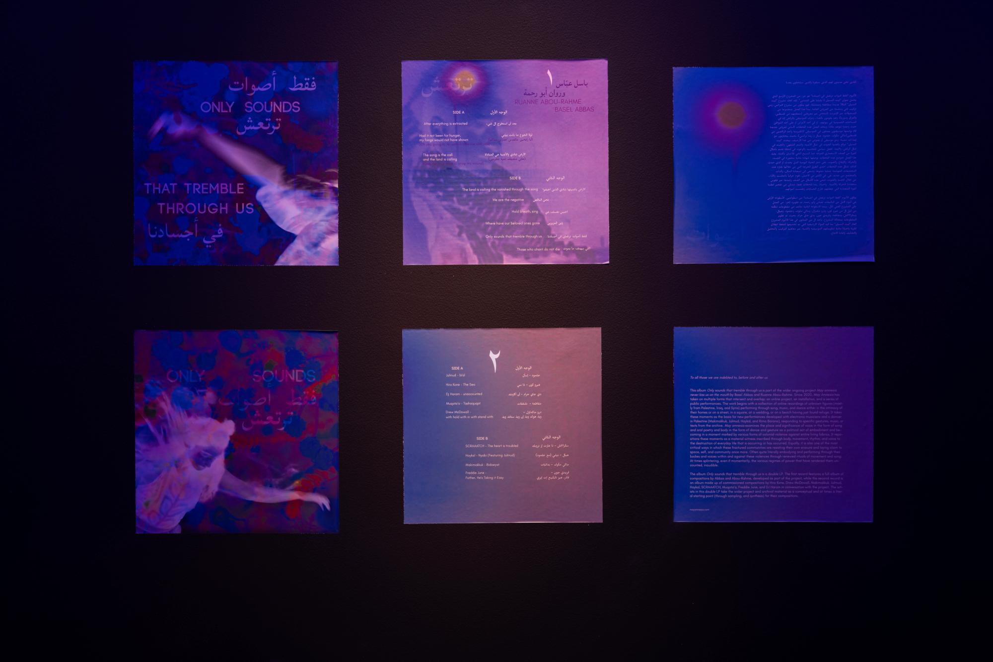 The album Only sounds that tremble through us is a double LP. The first record features a full album of compositions by Abbas and Abou-Rahme, developed as part of the project between 2022-2024, while the second record is an album made up of commissioned compositions by Hiro Kone, Drew McDowall, Makimakkuk, Julmud, Haykal, SCRAAATCH, Muqata’a, Freddie June, and DJ Haram in conversation with the project. The artists invited have all had a long engagement with the wider project; several of these artists had been invited by Abbas and Abou-Rahme to perform in the installation as part of the exhibitions of the work at the MoMA, whilst others are featured in the work itself. The artists in this double LP take the wider project and archival material as a conceptual and, at times, a literal starting point (through sampling and synthesis) for their compositions.