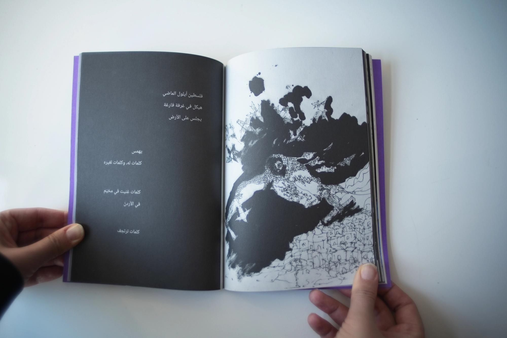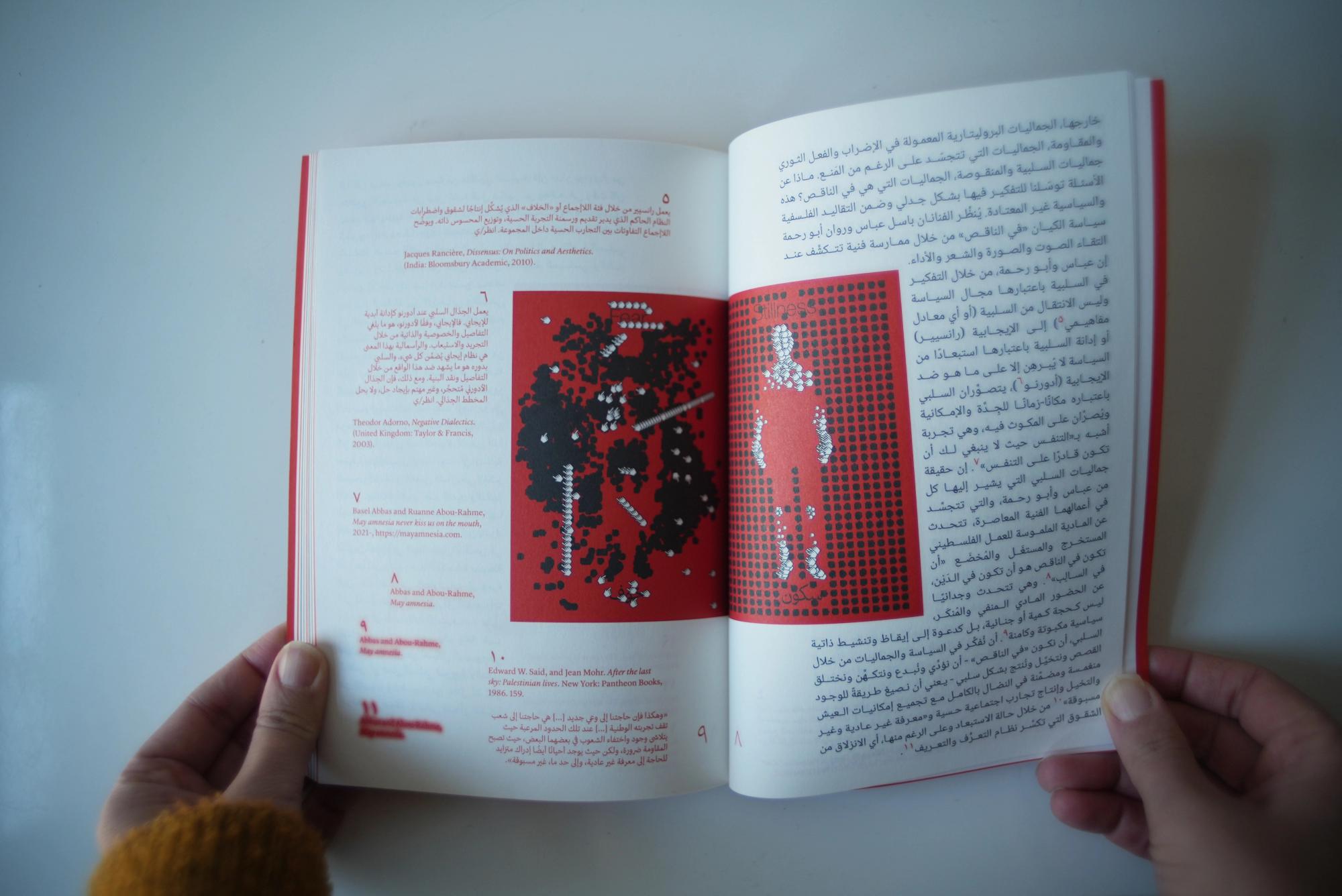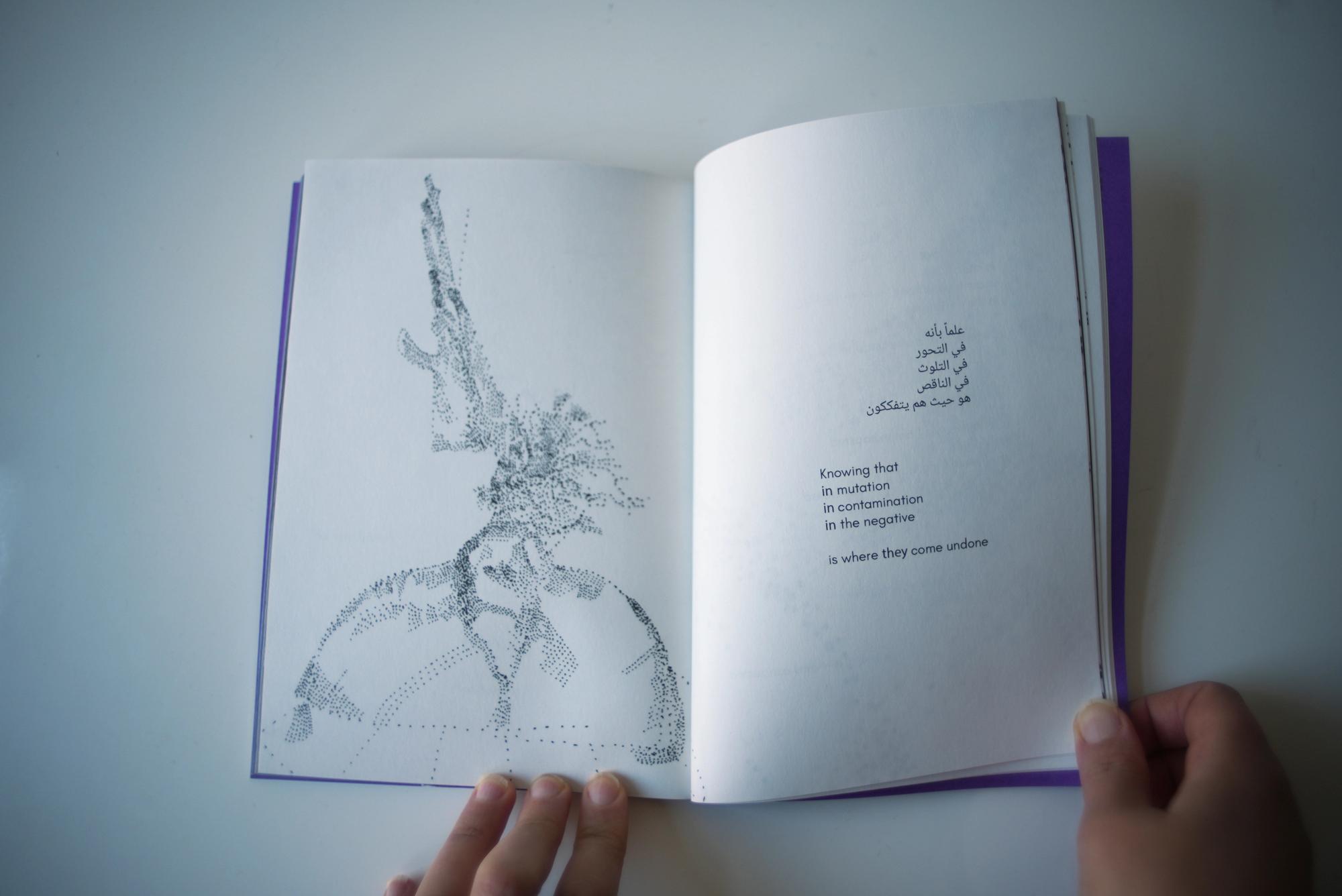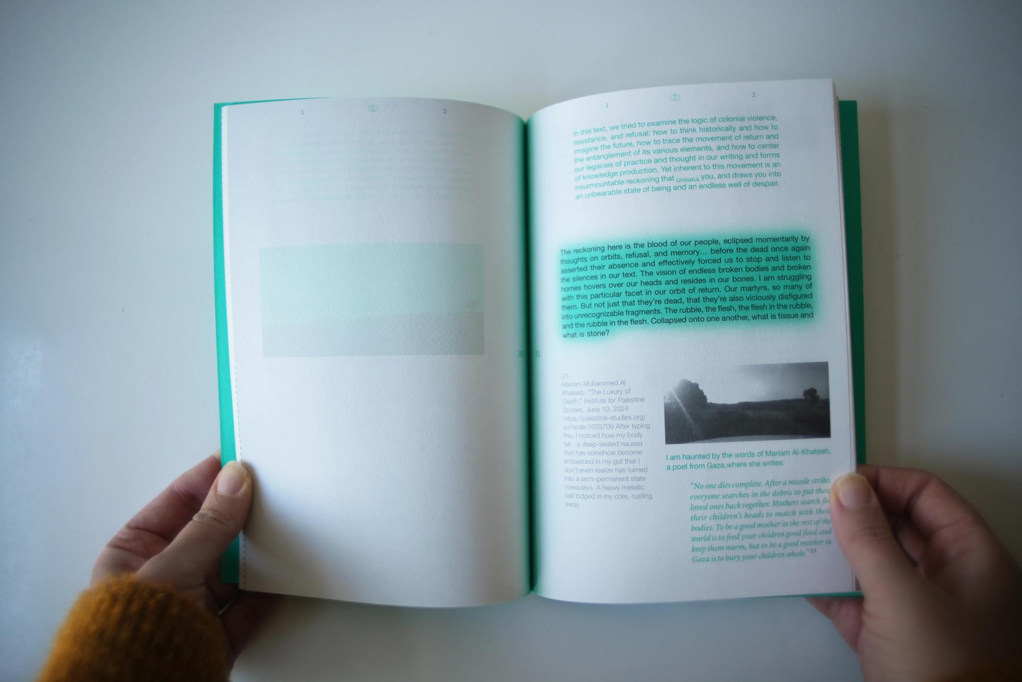 Alia Al-Sabi and Amany Khalifa take apart Palestinian ‘return’ through a conversation that unfolds across literary, temporal, and spacial registers. Amr Amer and Laura al-Tibi weave together song and critical analysis, unsettling colonial conceptions of Palestinians’ relation to their land economically and existentially. Basel Abbas and Ruanne Abou-Rahme offer a comprehensive hypothesis of the “negative,” unfolding across poetry, images, and illustration. Adam HajYahia and Haitham Haddad formulate an aesthetic theory of revolt, examined through text, images, and illustration. By focusing on the interplay between text and artistic form, “To all those we are indebted to” proposes new methods of thinking and creating, aesthetically and politically.