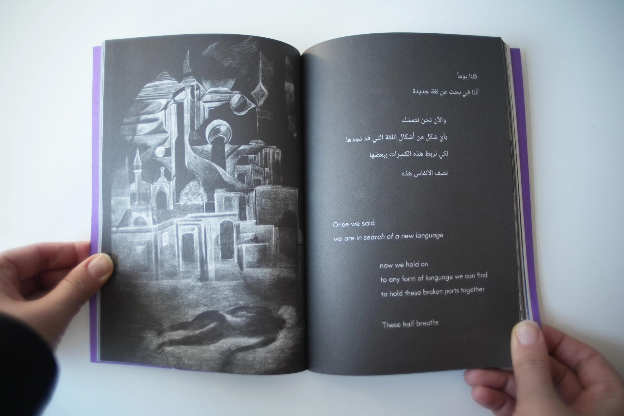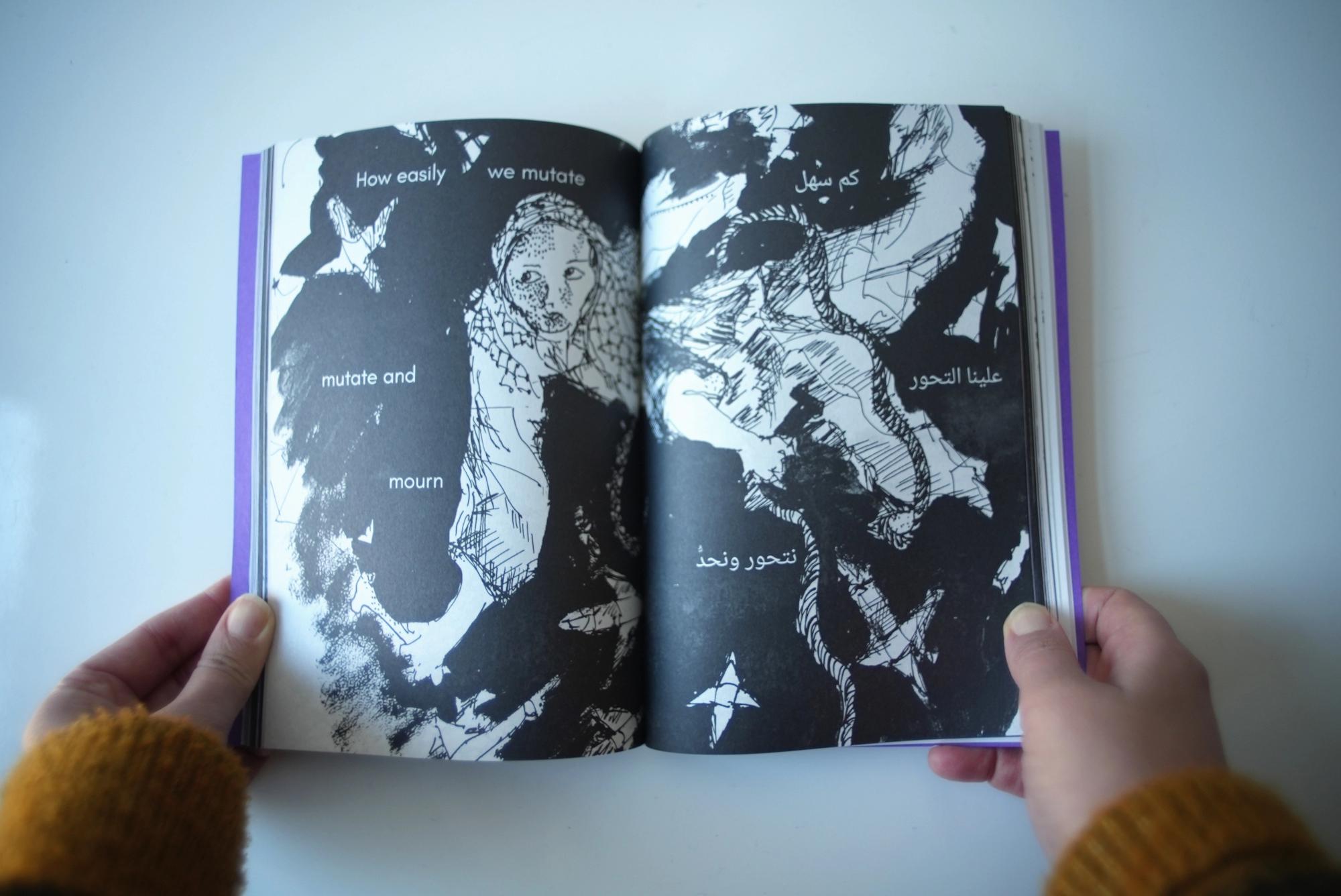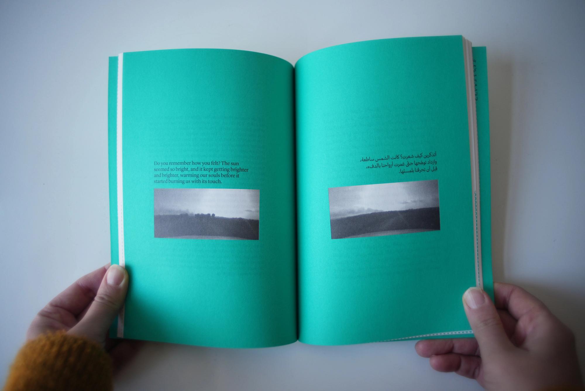 Alia Al-Sabi and Amany Khalifa take apart Palestinian ‘return’ through a conversation that unfolds across literary, temporal, and spacial registers. Amr Amer and Laura al-Tibi weave together song and critical analysis, unsettling colonial conceptions of Palestinians’ relation to their land economically and existentially. Basel Abbas and Ruanne Abou-Rahme offer a comprehensive hypothesis of the “negative,” unfolding across poetry, images, and illustration. Adam HajYahia and Haitham Haddad formulate an aesthetic theory of revolt, examined through text, images, and illustration. By focusing on the interplay between text and artistic form, “To all those we are indebted to” proposes new methods of thinking and creating, aesthetically and politically.