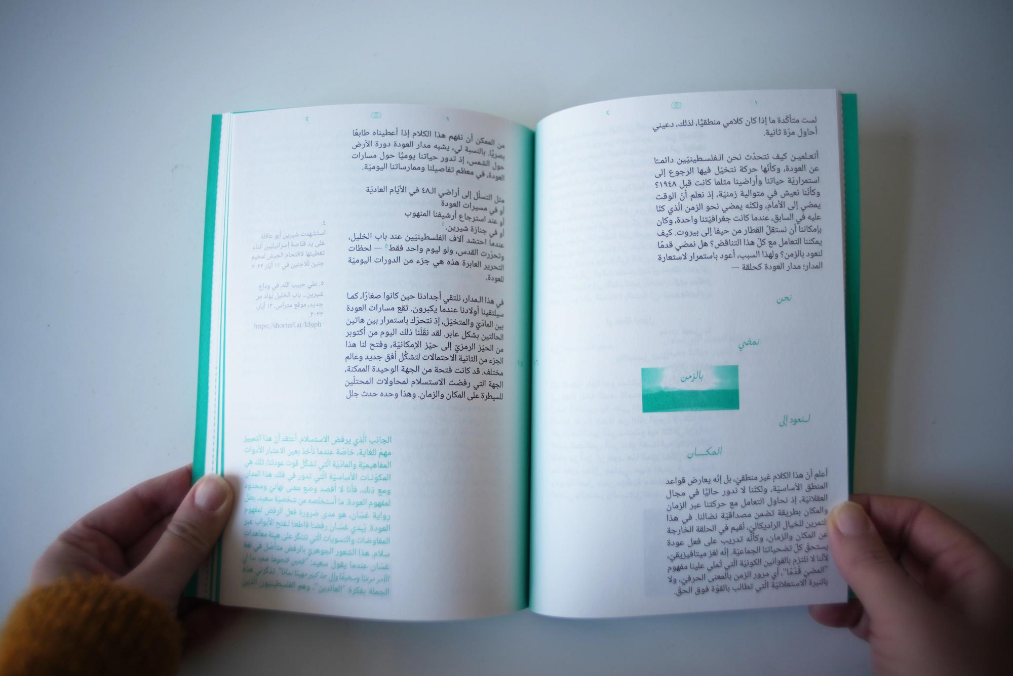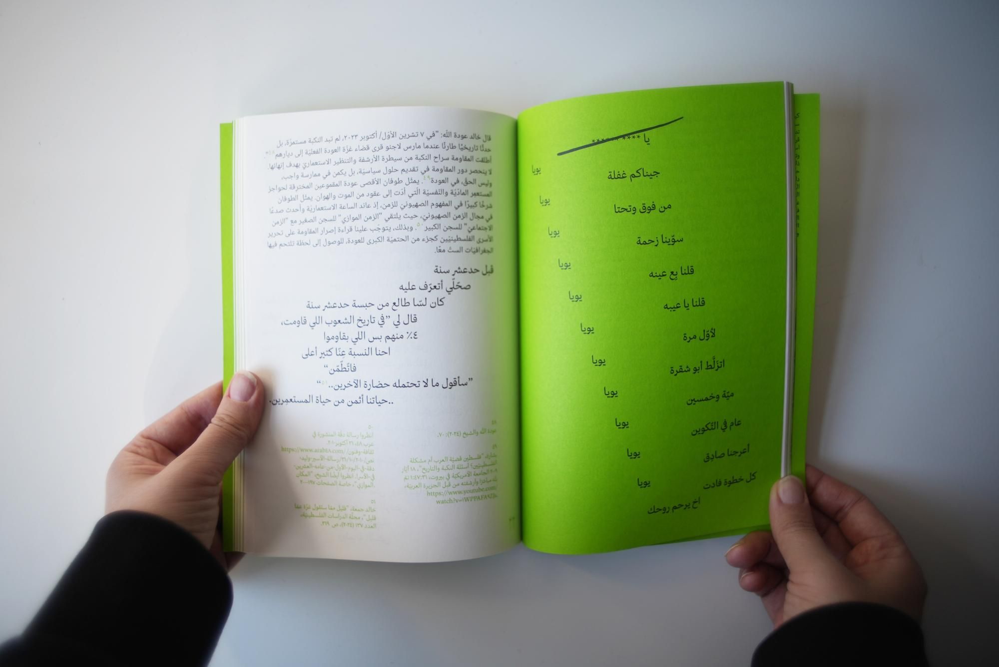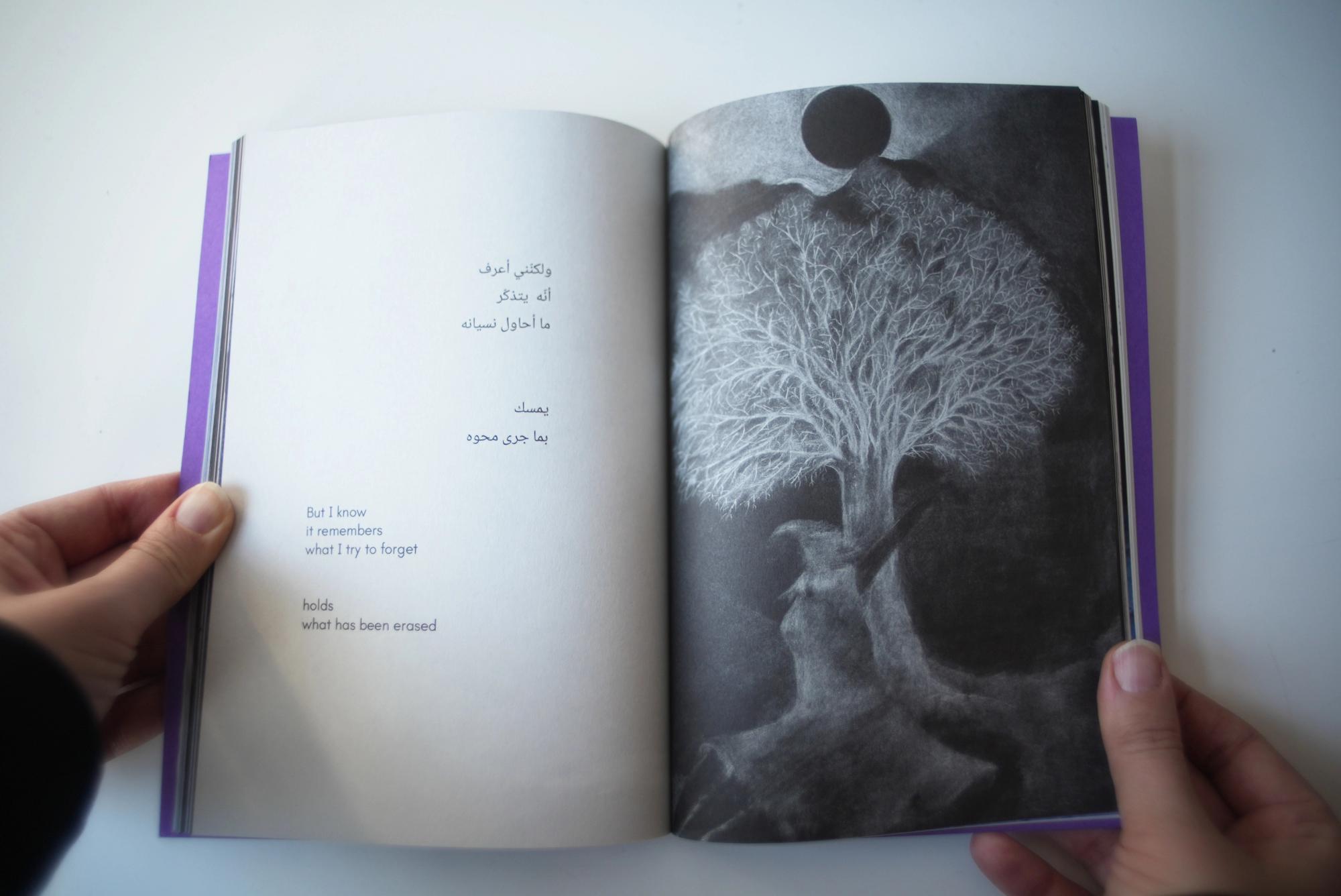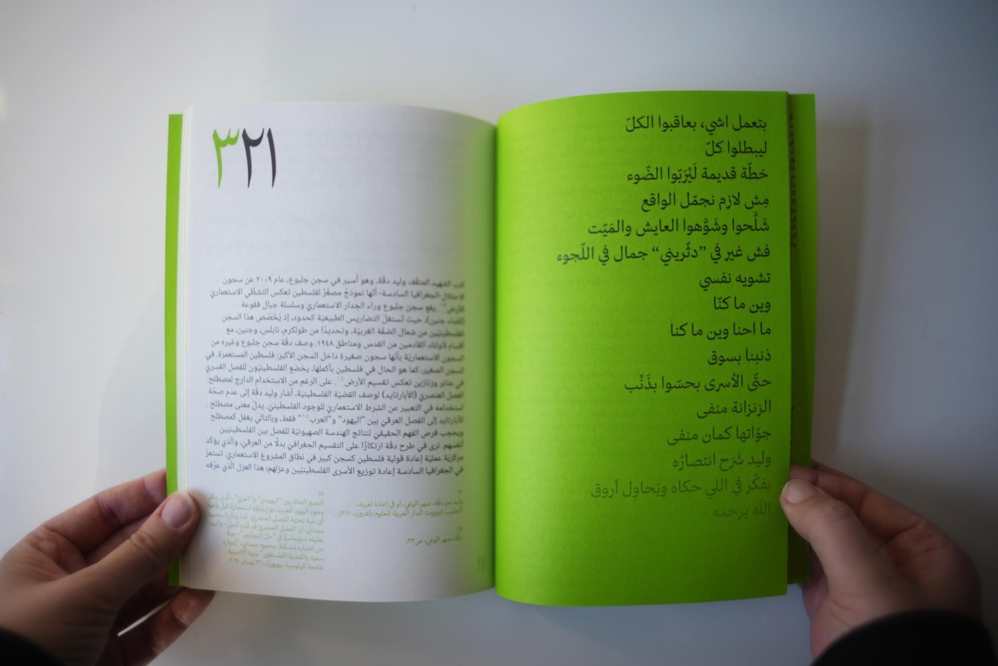 Alia Al-Sabi and Amany Khalifa take apart Palestinian ‘return’ through a conversation that unfolds across literary, temporal, and spacial registers. Amr Amer and Laura al-Tibi weave together song and critical analysis, unsettling colonial conceptions of Palestinians’ relation to their land economically and existentially. Basel Abbas and Ruanne Abou-Rahme offer a comprehensive hypothesis of the “negative,” unfolding across poetry, images, and illustration. Adam HajYahia and Haitham Haddad formulate an aesthetic theory of revolt, examined through text, images, and illustration. By focusing on the interplay between text and artistic form, “To all those we are indebted to” proposes new methods of thinking and creating, aesthetically and politically.