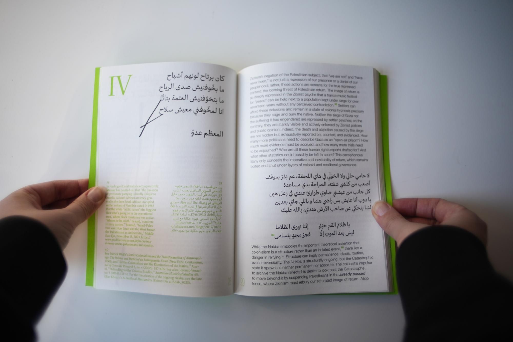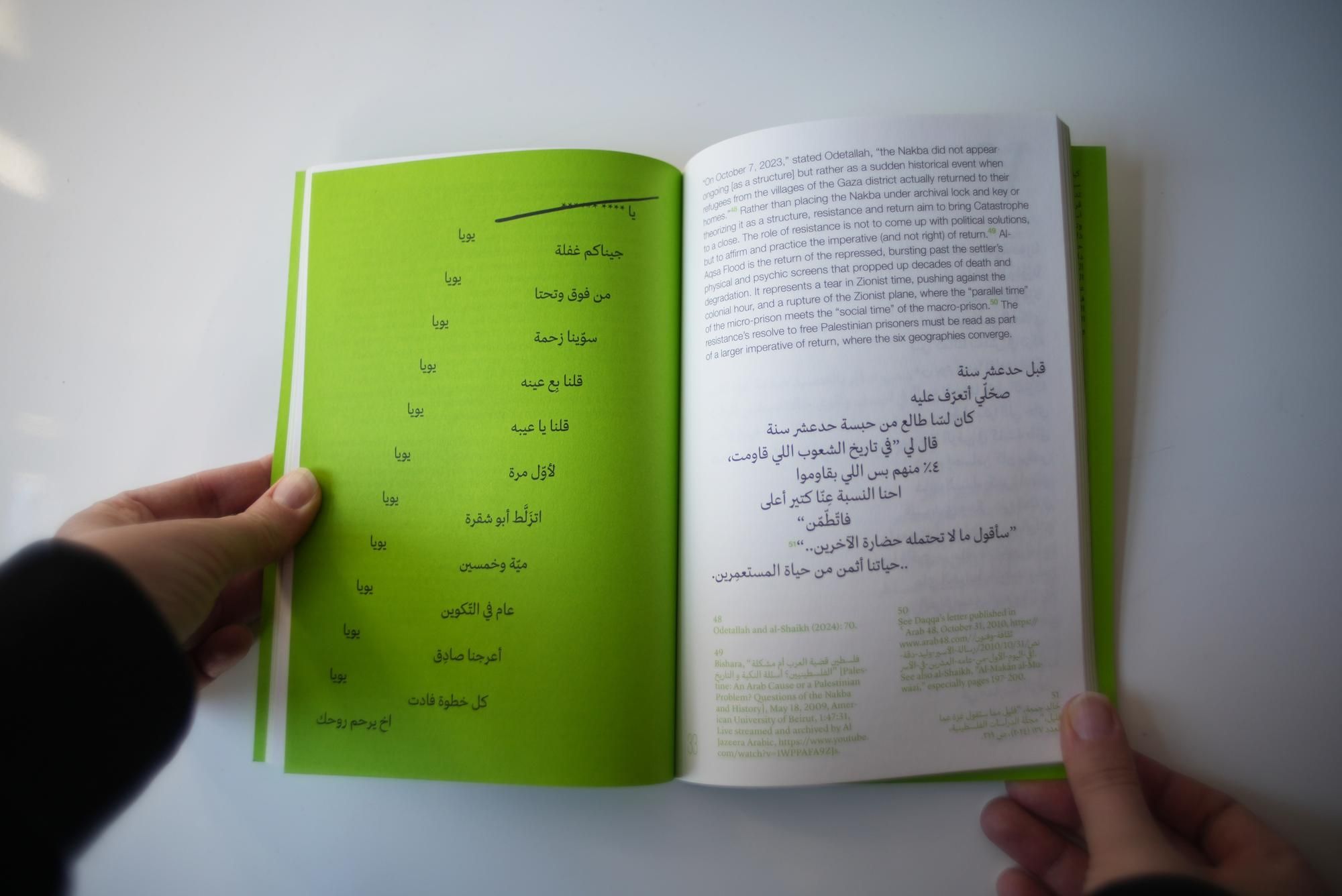 What form does the enormity of the Palestinian Catastrophe take, and by which political grammars is its ongoing condition disrupted and contested? Combining materialist critique with poetic interjections, the authors propose reading the Nakba neither as an isolated event nor a reified structure, but as a series of violent negations running parallel to the catalytic force of resistance. In doing so, they redirect focus from overdetermined theorizations of colonial violence to generative practices of refusal, cautioning against the structural heft and imposed permanence of settler-colonialism. As Palestinians have repeatedly shown, the colonial limit is not impenetrable. The booklet also critically engages with iterations of Palestine’s vanishing map, commonly circulated as a convenient summary of dispossession. These cartographic representations are reinterpreted as a negative image that comes into focus with each act of resistance, gradually processing as land and self are restored.